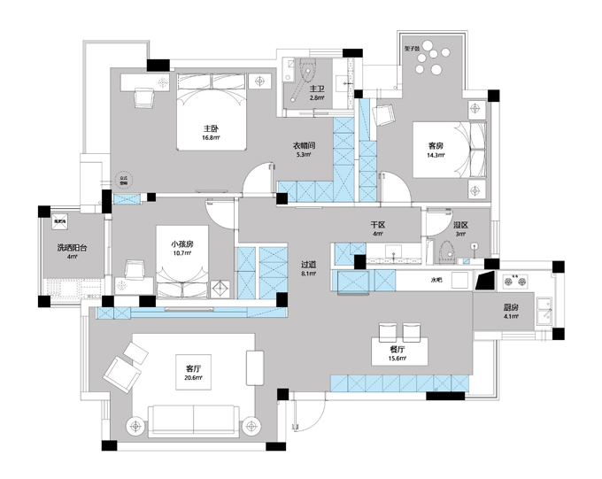 4.縮小南面洗曬陽(yáng)臺(tái),增加小孩房的面積,取消臥室和客廳的入口,從小孩房進(jìn)洗衣房,這樣臥室的私密感會(huì)好很多,同時(shí)也讓小孩房和洗曬的功能更加合理。